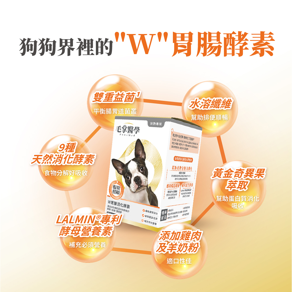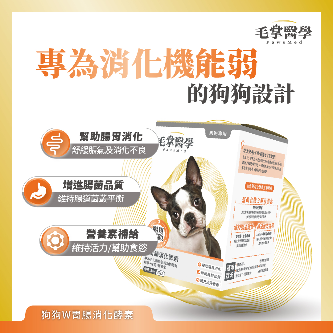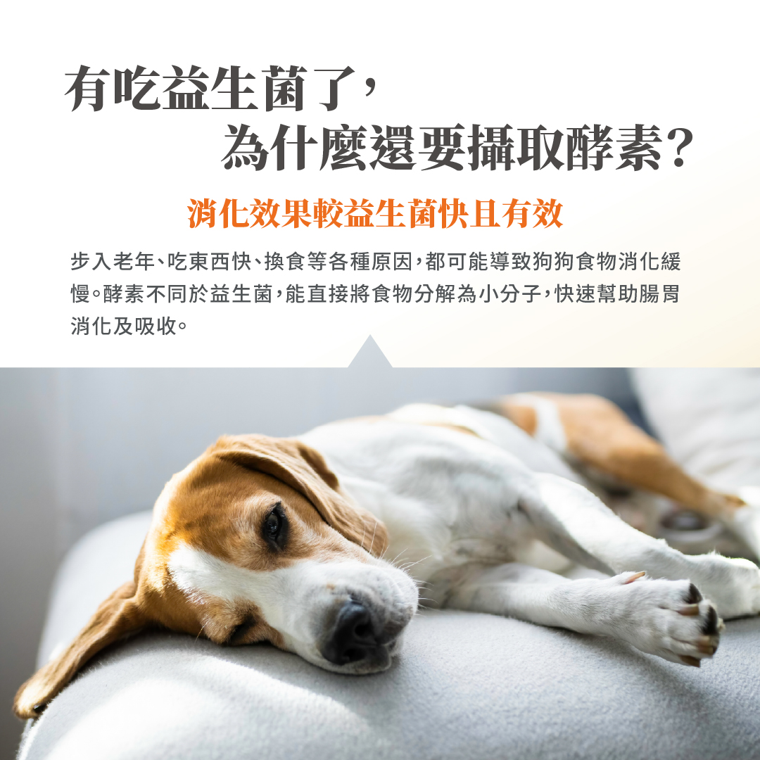 A:酵素適合緊急的腸胃消化不良狀況,但若狗狗出現及持續出現嘔吐、腹瀉等症狀,建議請急速就醫確認病因,確實排除問題。
