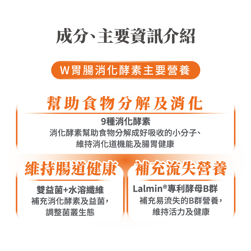 主成分:綜合消化酵素(木瓜酵素、鳳梨酵素、角蛋白酵素、蛋白分解酵素、脂肪酵素、澱粉酵素、纖維酵素、葡萄糖澱粉酶、蔗糖酶)、Lalmin®專利酵母B群、黃金奇異果萃取、蘋果纖維、比菲德氏龍根菌BB536、副乾酪乳酸桿菌