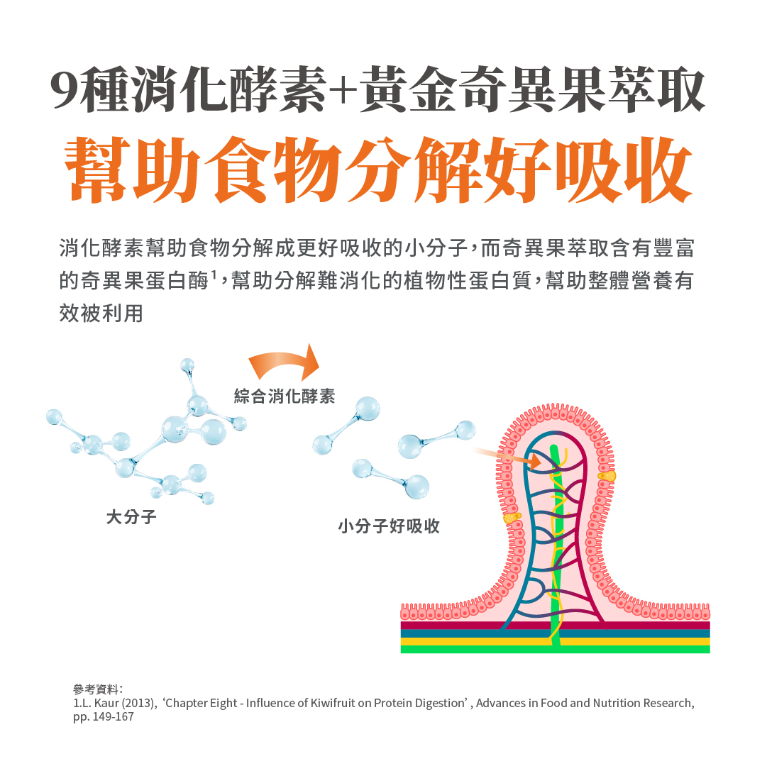 綜合消化酵素含多種食物分解酵素,幫助食物分解成好吸收的小分子。綠奇異果萃取含有豐富的蛋白酶),幫助蛋白質吸收,維持好體力