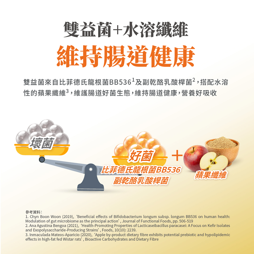 雙益菌來自比菲德氏龍根菌BB536及副乾酪乳酸桿菌,搭配水溶性的蘋果纖維,維持腸道好菌生態,維持腸道健康,營養好吸收