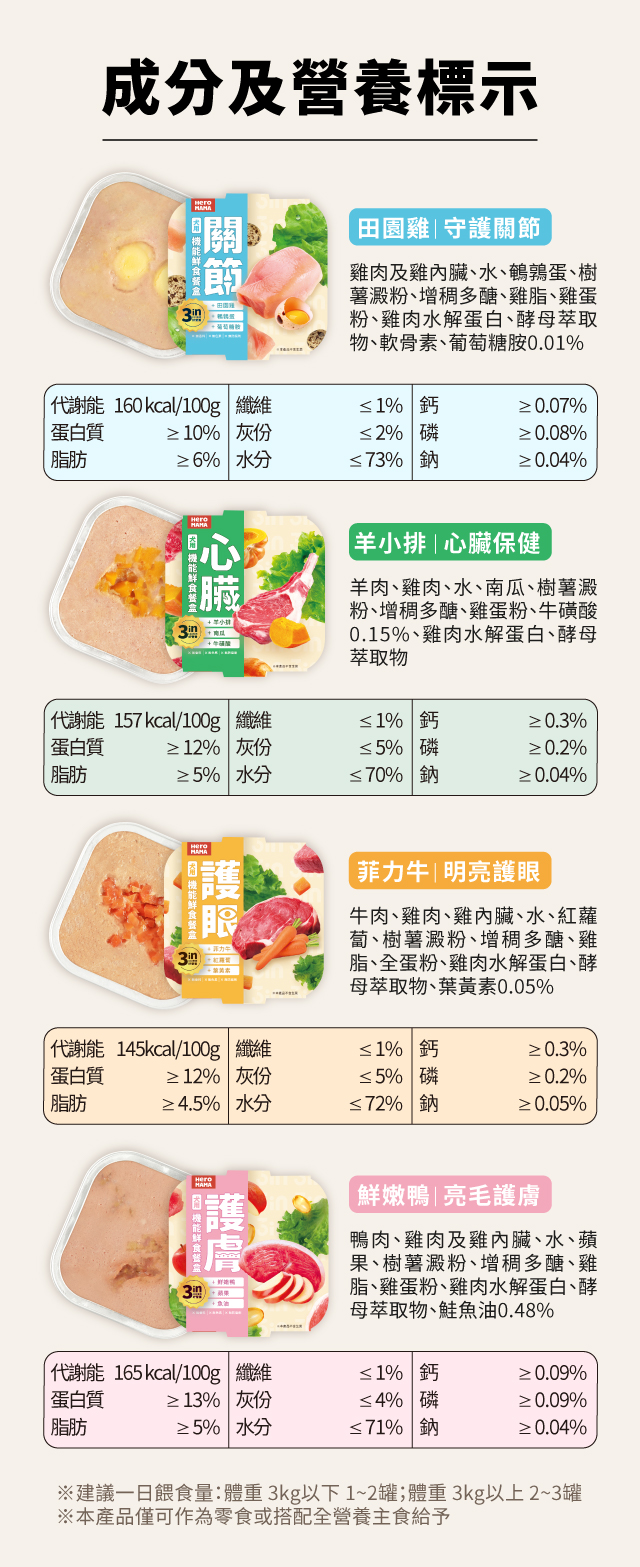 餵食建議:體重3kg以下每日1~2罐;體重3kg以上每日2~3罐。僅可作為零食或搭配全營養主食給予