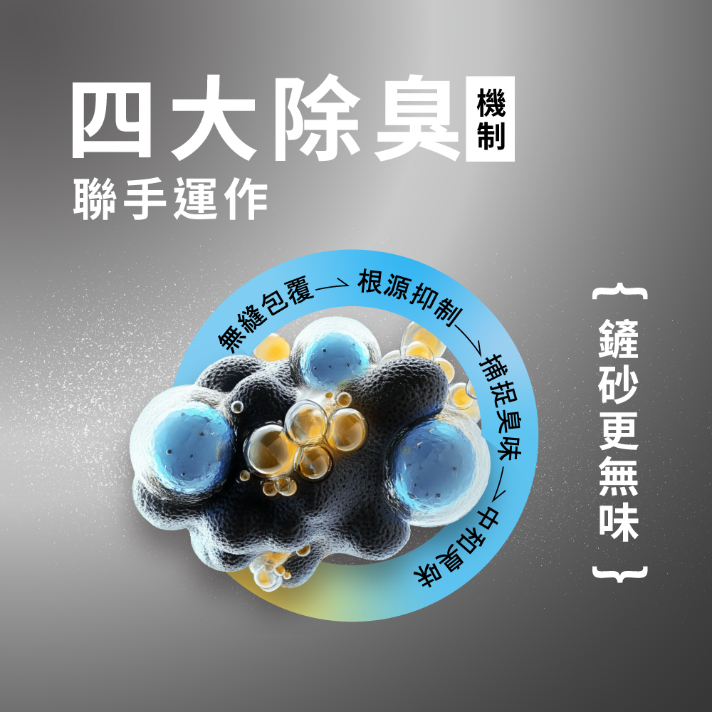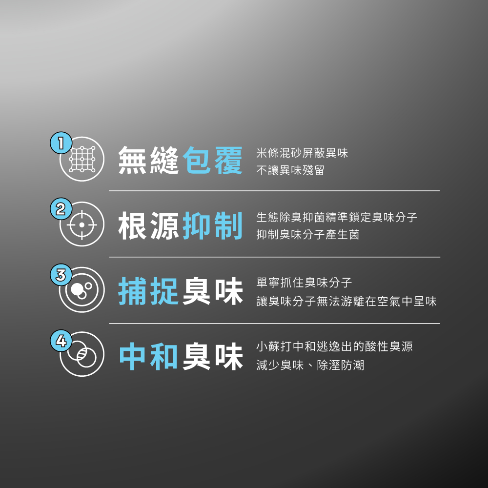 成分:豌豆纖維、玉米澱粉、單寧及小蘇打除臭顆粒、瓜爾豆膠、生態除臭抑菌物質