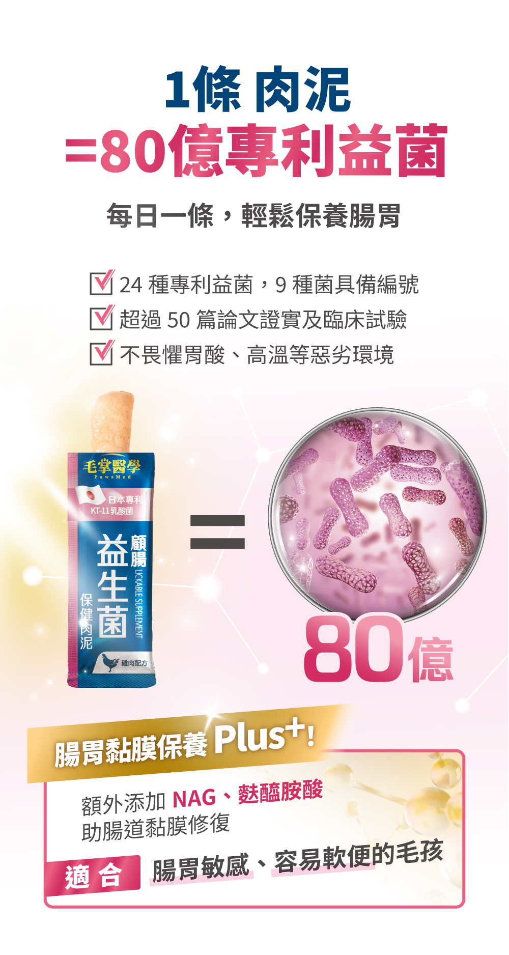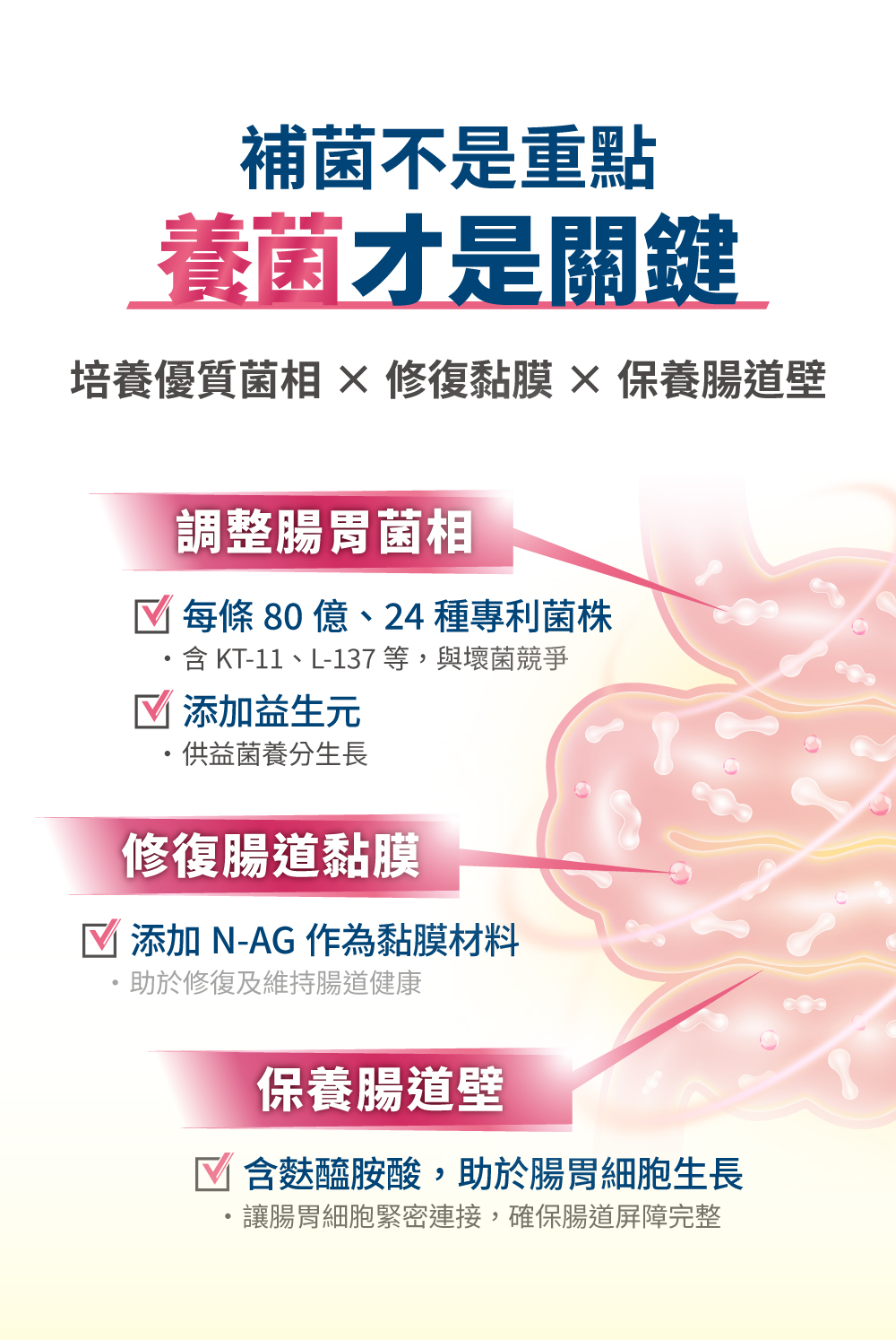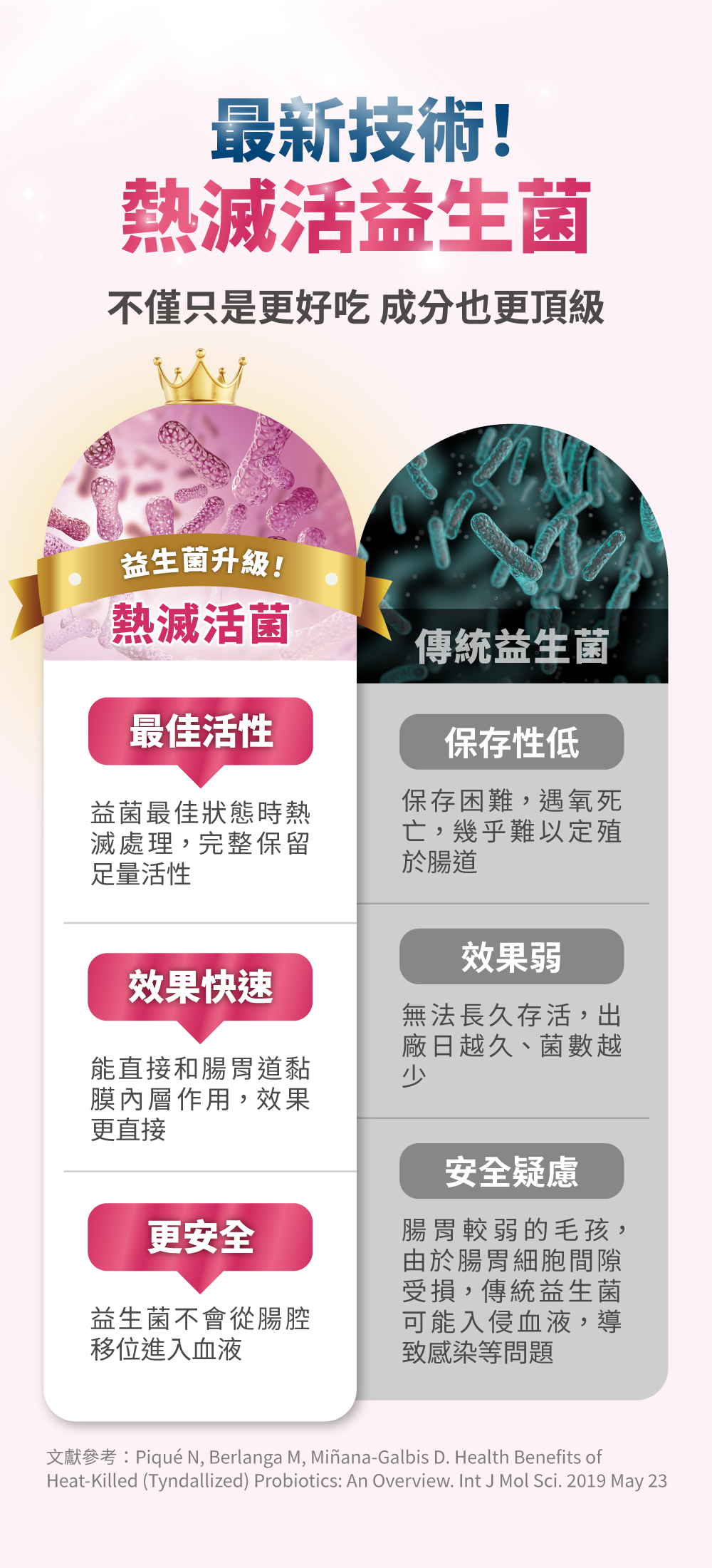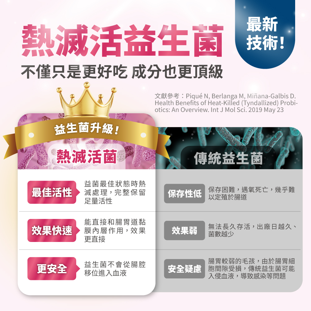 熱滅活益生菌:培養菌到活性最高的狀況後,熱滅封存有效成分(細胞壁、短鏈脂肪酸、代謝物等),可直接和腸胃作用,效果比傳統的益生菌快速且直接。