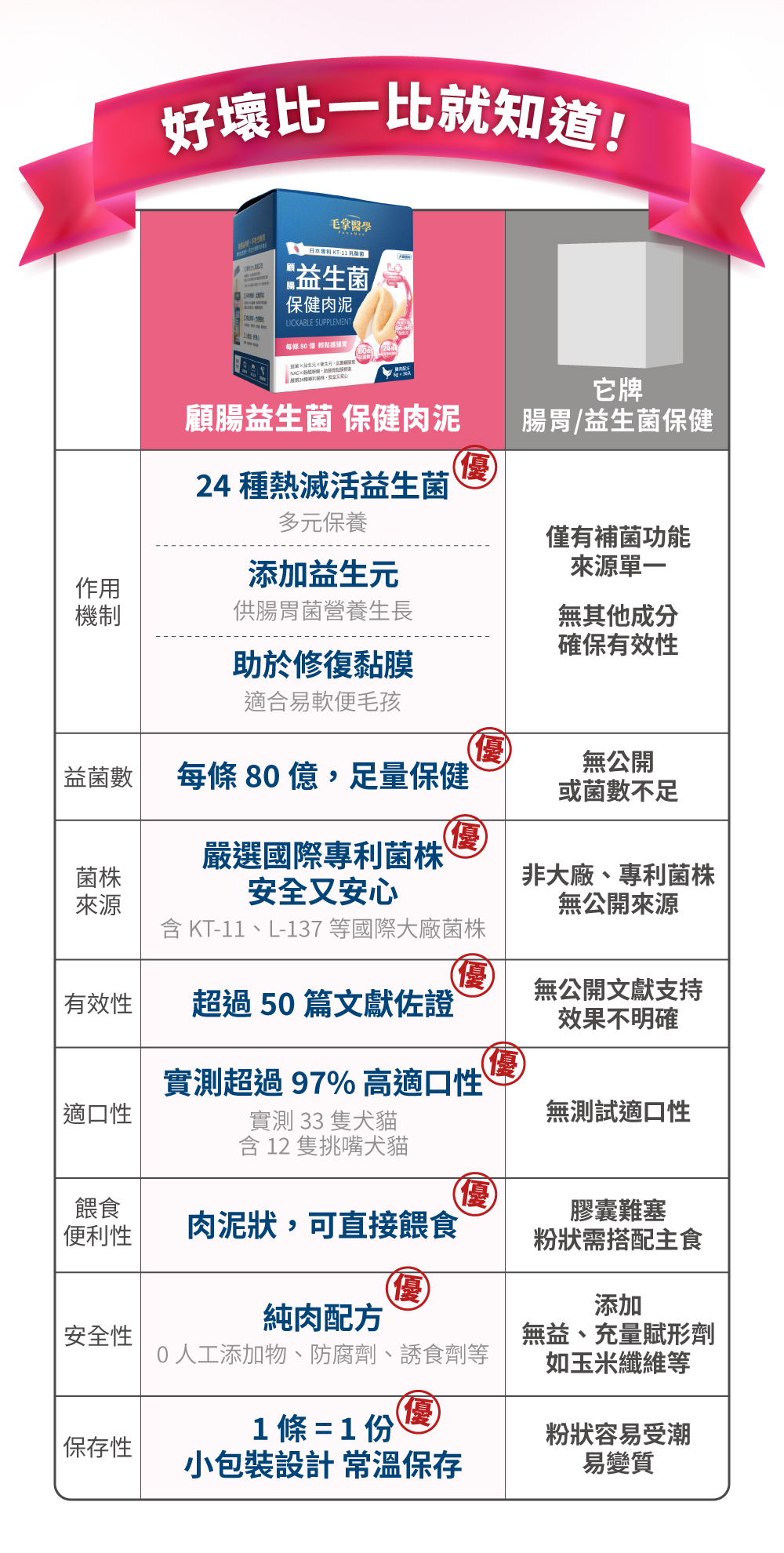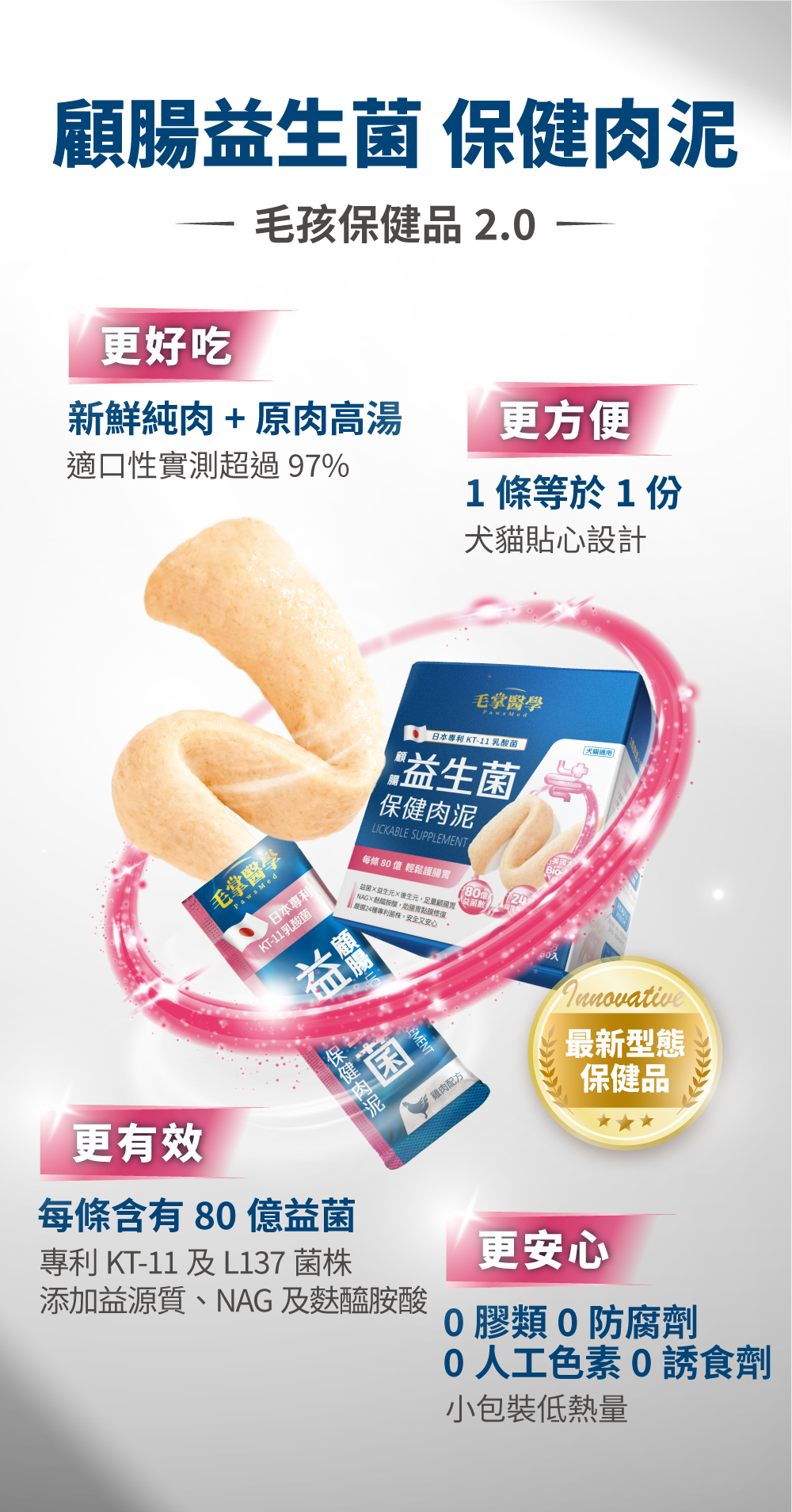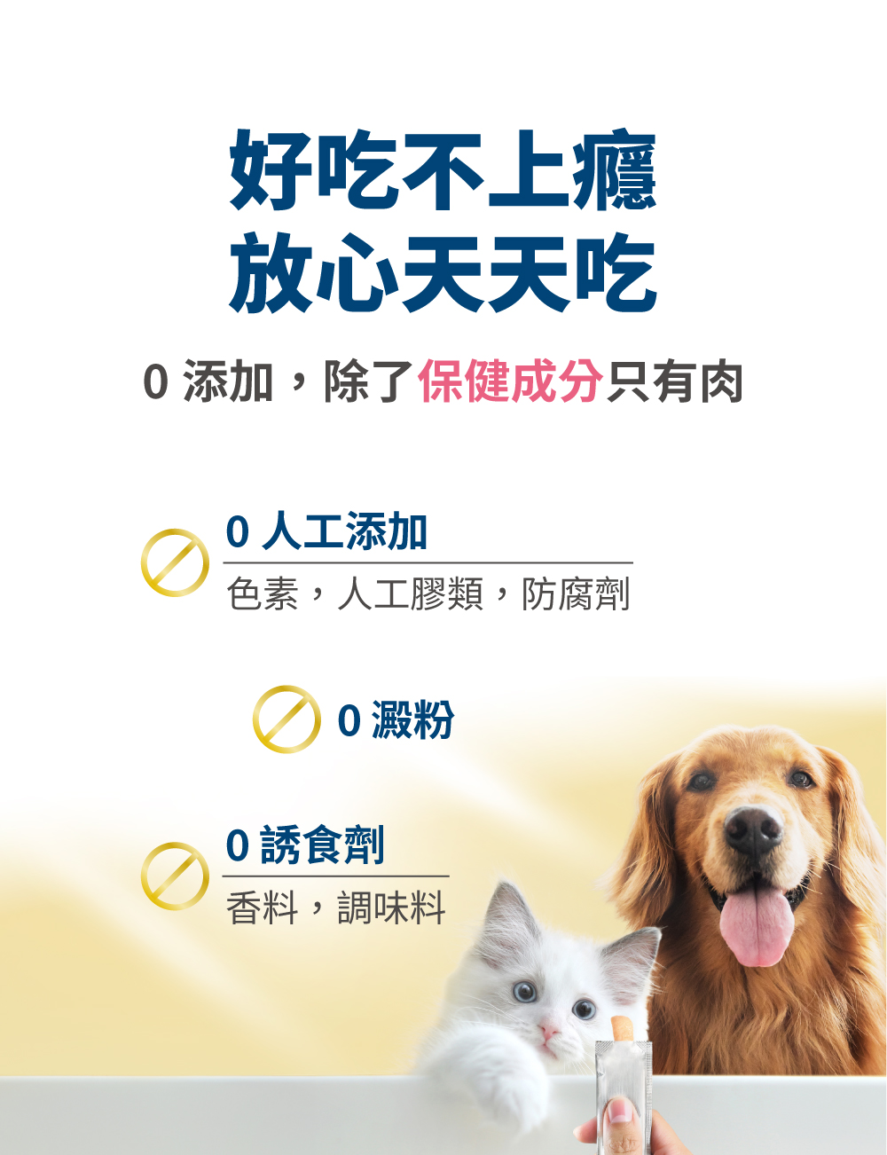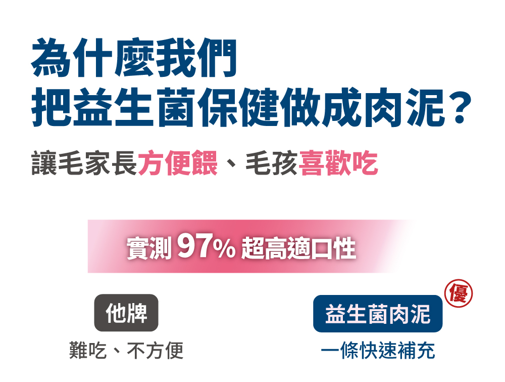 我們堅持並保證不添加任何加工食品,絕不含防腐劑、誘食劑、香精、人工色素等,對毛孩有害的添加物。肉泥嗜口性來自長達2年的技術開發,透過天然水解、選用純肉、高數研磨等高端技術,結合寵物嗜口性研究,才有辦法製成符合毛孩習性、愛吃的風味。
