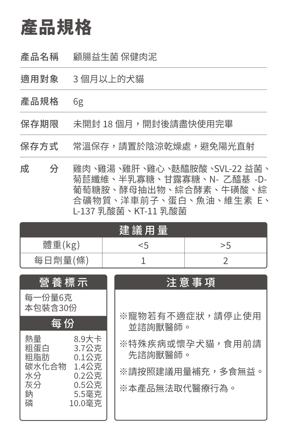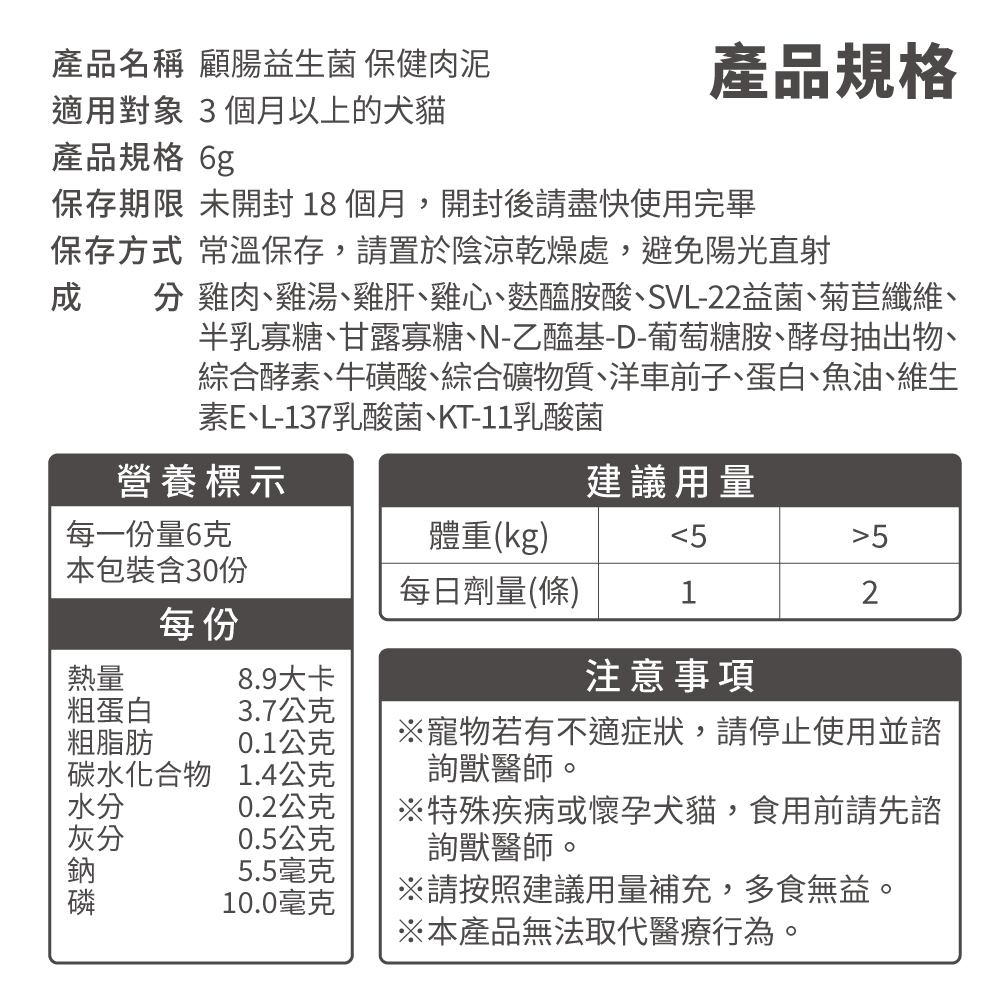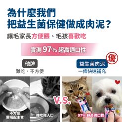 我們將肉泥做成單包小分量,每份僅8.2大卡(約5kg犬貓2-3%每日建議熱量),讓毛孩吃得健康不負擔!