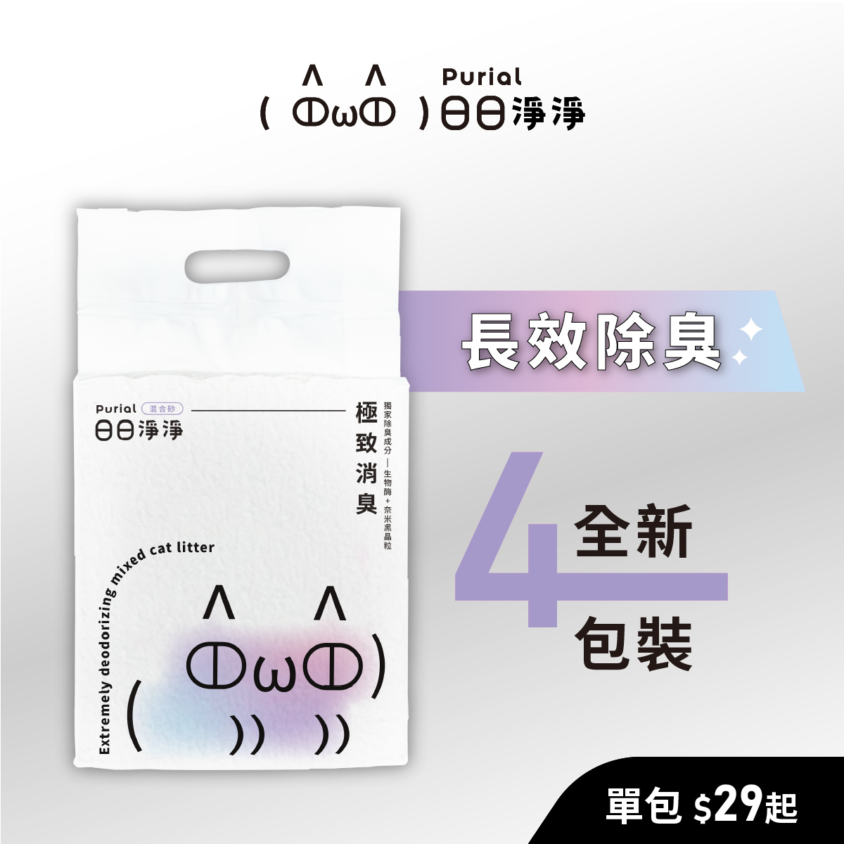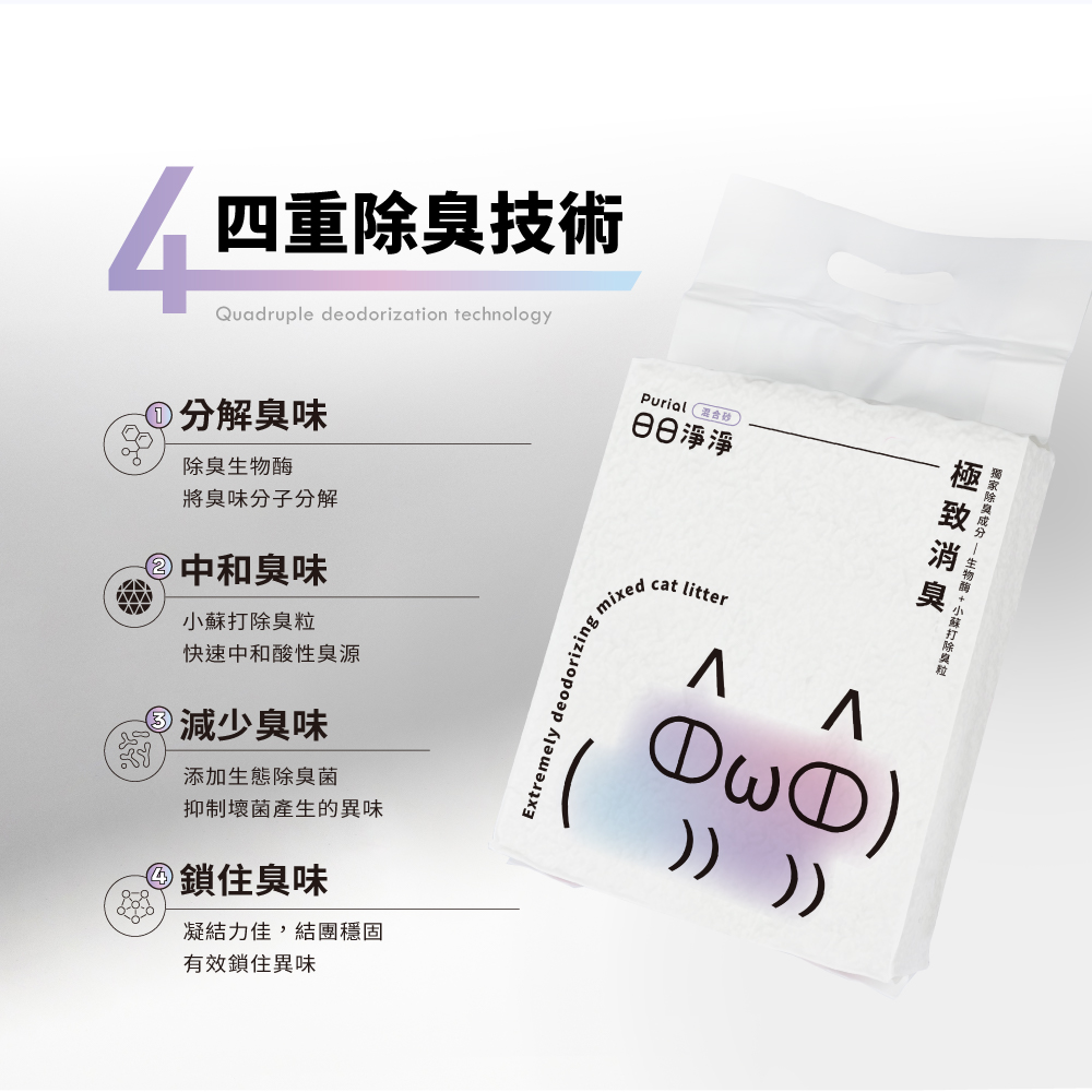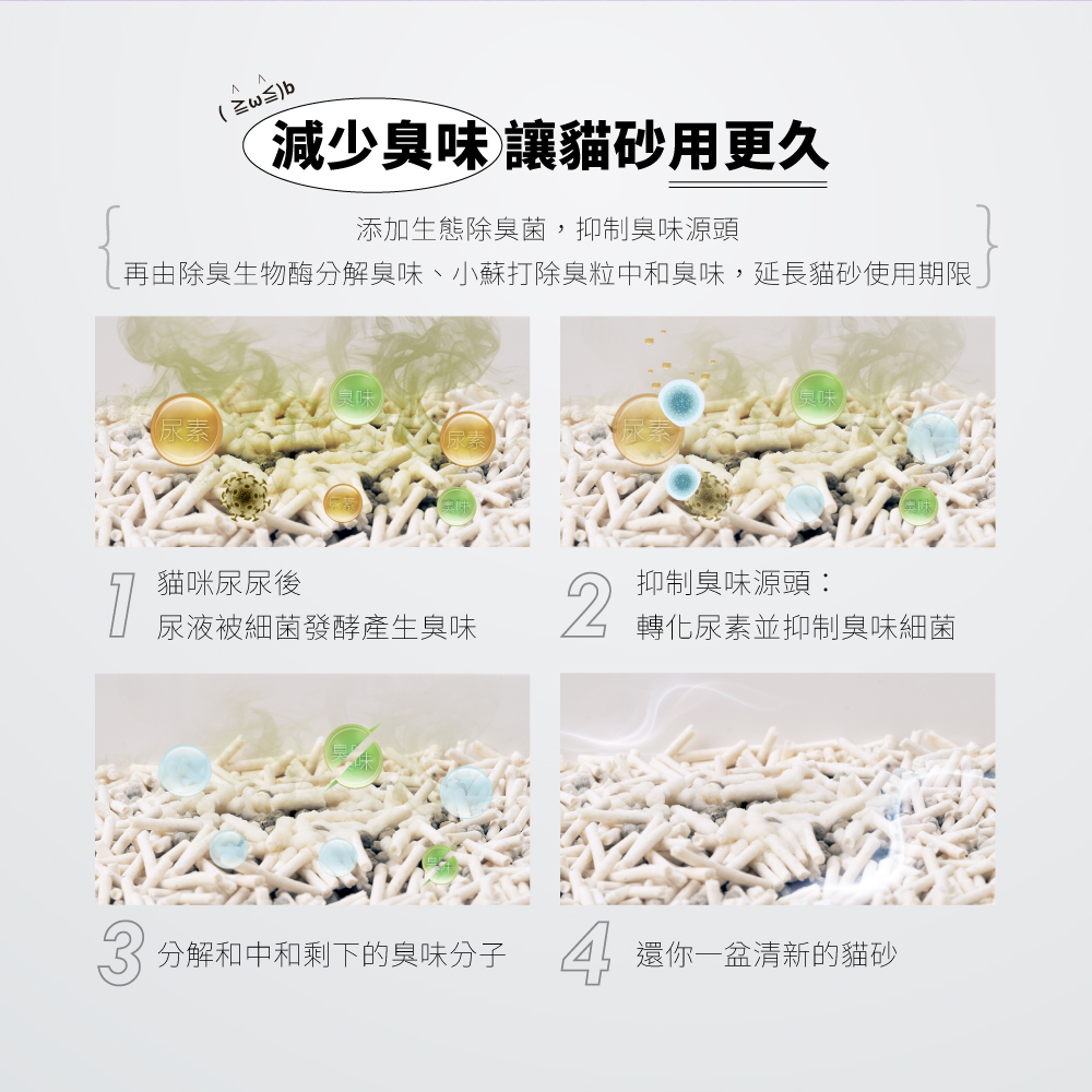 ▸採用四重除臭技術為基礎,減少貓砂異味,延長貓砂使用時間