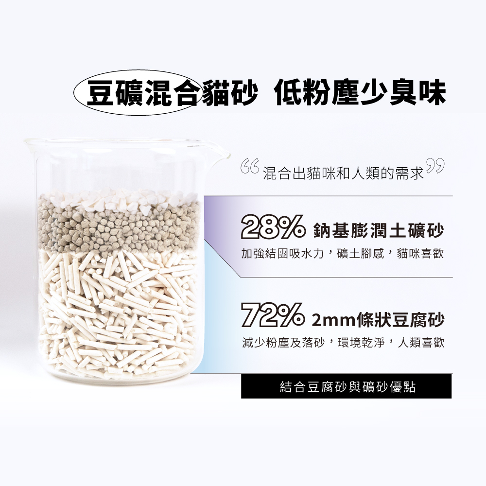 ▸72% 2mm條狀豆腐砂: 減少粉塵及落砂,環境乾淨,人類喜歡