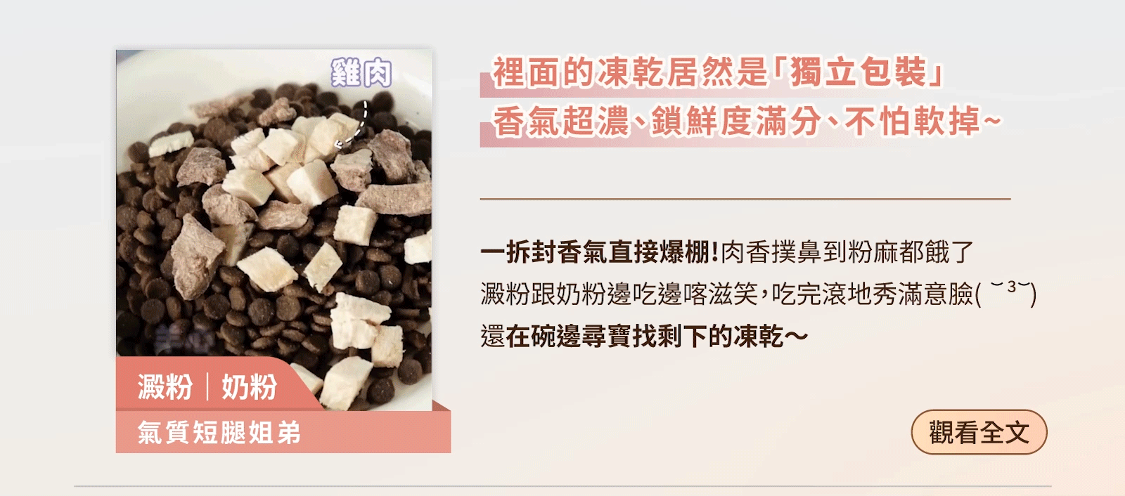 許多家長選擇凍乾拼糧,是想讓毛孩吃更多「原肉」營養,但市售拼糧有些凍乾是一半肉一半蛋、蔬果,甚至營養標示把飼料與凍乾混算一起,讓蛋白質比例更漂亮;而低成本混裝,還會造成凍乾長時間吸附飼料味道的困擾,因此有些家長會自行添購凍乾,親手「重拼」給毛孩。