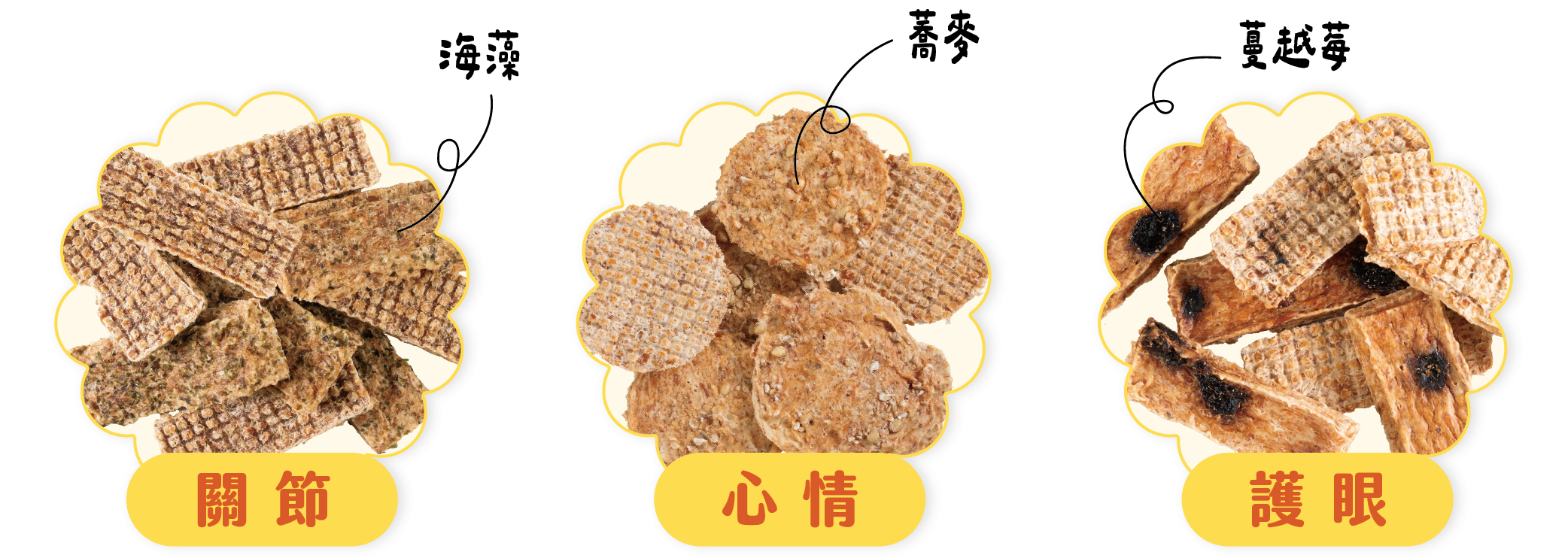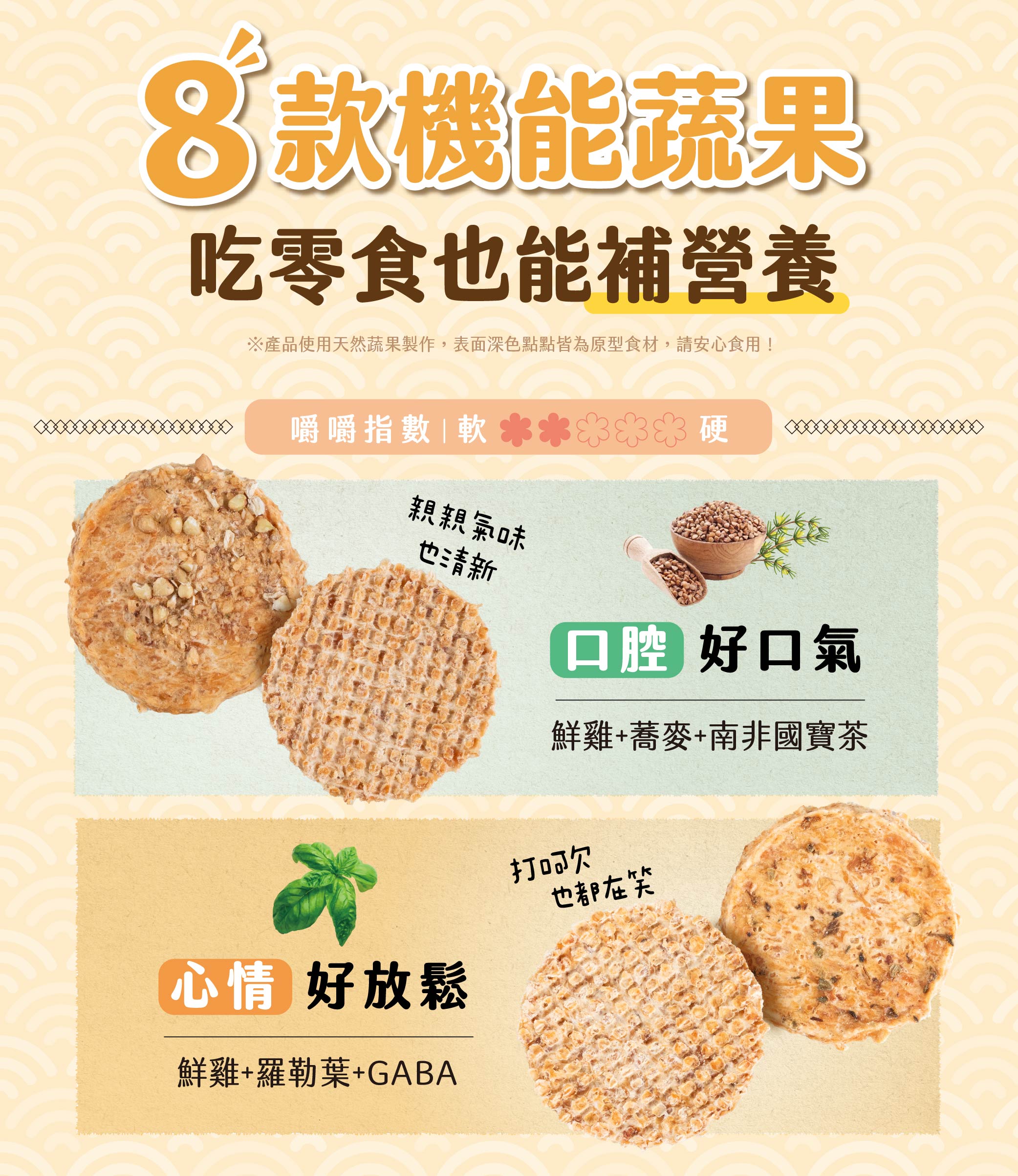 像蕎麥、藍莓、羅勒葉等等蔬果,這些都是天然食材本身的顏色、纖維或微小顆粒,且都是用真實原料添加,故製程後仍會在表面看得見,此情況屬正常現象,請安心給毛孩食用~