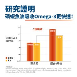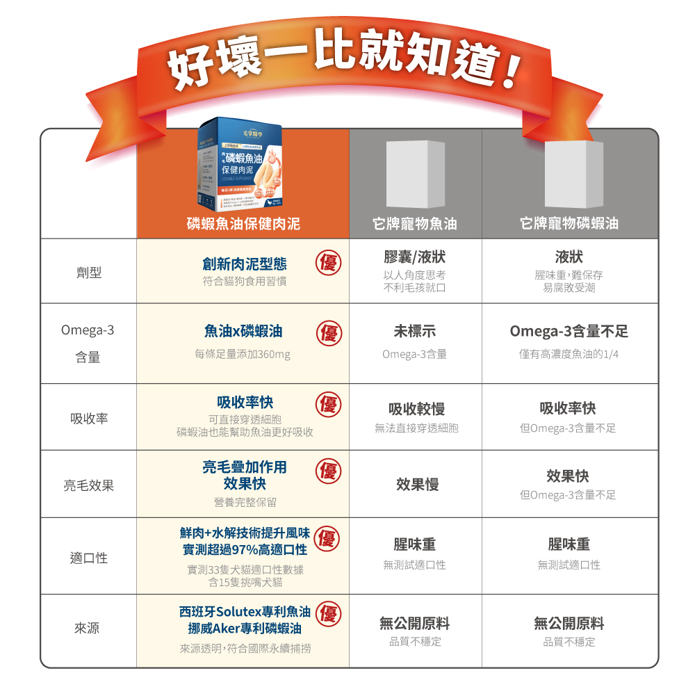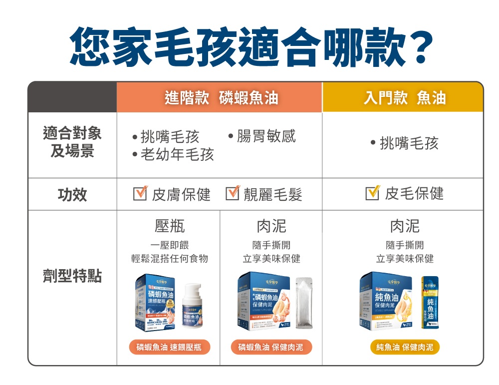 「亮毛磷蝦魚油 保健肉泥」含磷蝦油中的磷脂型Omega-3以及天然磷脂,吸收效果比「純魚油 保健肉泥」更好(約2倍),適合腸胃敏感、老年、幼年犬貓。「亮毛磷蝦魚油 保健肉泥」也含有蝦紅素及膽鹼,對免疫、毛髮、關節等其他部位也有保健功能。