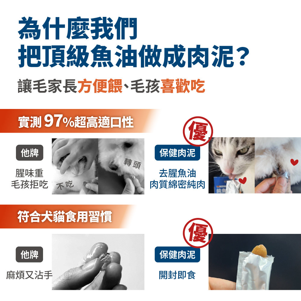 保健肉泥保證不添加任何加工食品,絕不含防腐劑、誘食劑、香精、人工色素等,對毛孩有害的添加物。肉泥嗜口性來自長達2年的技術開發,透過天然水解、選用純肉及內臟、高速研磨等高端技術,結合寵物嗜口性研究,才有辦法製成符合毛孩習性、愛吃的風味。