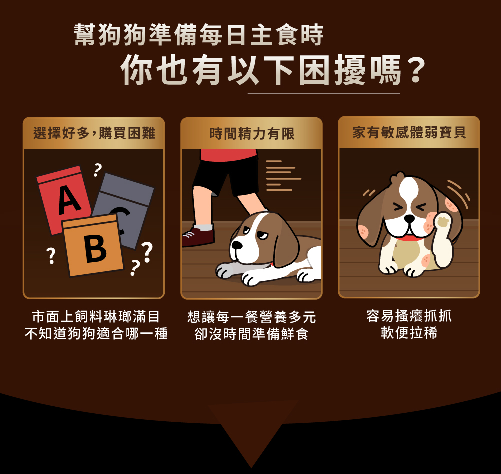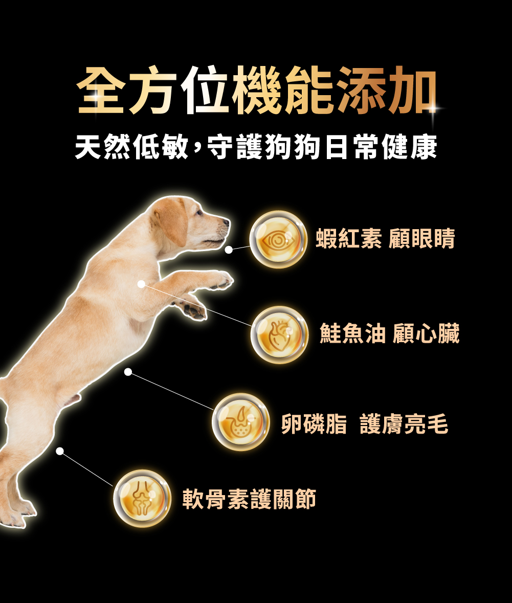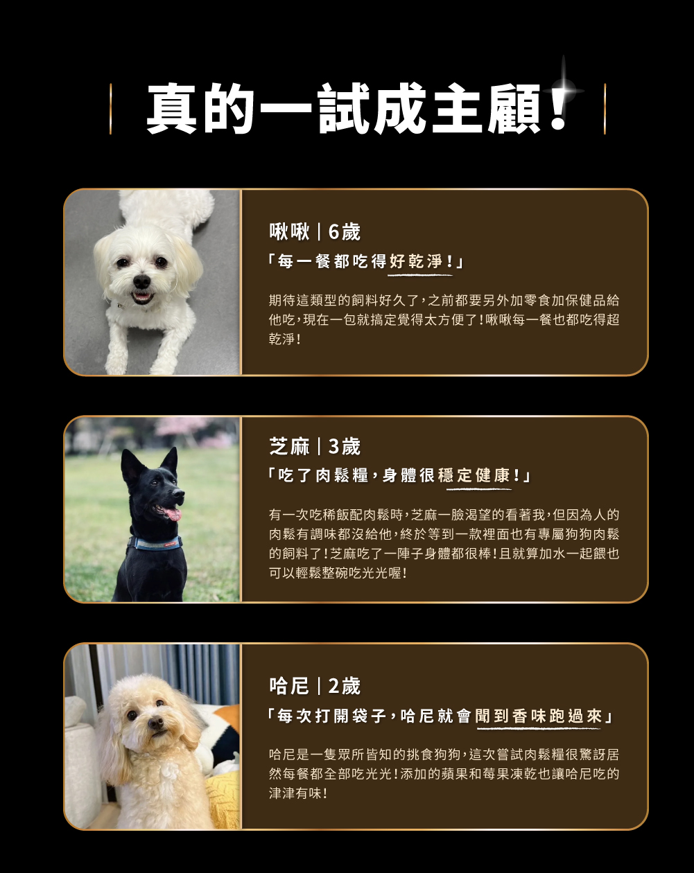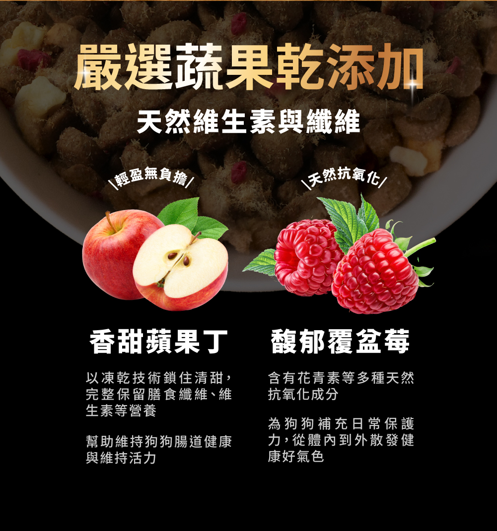 | 雞魚拌肉鬆餐 | 乾燥雞肉,乾燥魚肉,雞脂肪,豌豆,無調味豬肉鬆,蘋果,覆盆莓,樹薯澱粉,紅藜麥,小肽蛋白,水解酵母,乳酪粉,脫水雞肝,鮭魚油,蔓越莓、綠花椰菜、膳食纖維,甘露寡糖,牛磺酸,離胺酸,蛋胺酸,氯化鉀,氯化鈉,礦物質(鐵、鋅、銅、錳),卵磷脂,葡萄糖胺,軟骨素,鱉蛋粉,蝦紅素,綜合維生素(維生素 A、維生素 D3 、維生素 C、維生素 E、維生素 K3 、維生素 B1 、維生素 B2 、維生素 B6 、維生素 B12 、菸鹼酸、泛酸鈣、葉酸、生物素),絲蘭,酵母硒,益生菌,天然抗氧化劑 | 代謝能360.8kcal/100g、蛋白質≥30.0%、脂肪≥15.8%、碳水化合物≥34.9%、灰分≤7.8%、粗纖維≤3.8%、水分≤7.7%、鈉≥0.3%、磷≥1.0%、鈣≥1.3%、鎂≥0.1% |