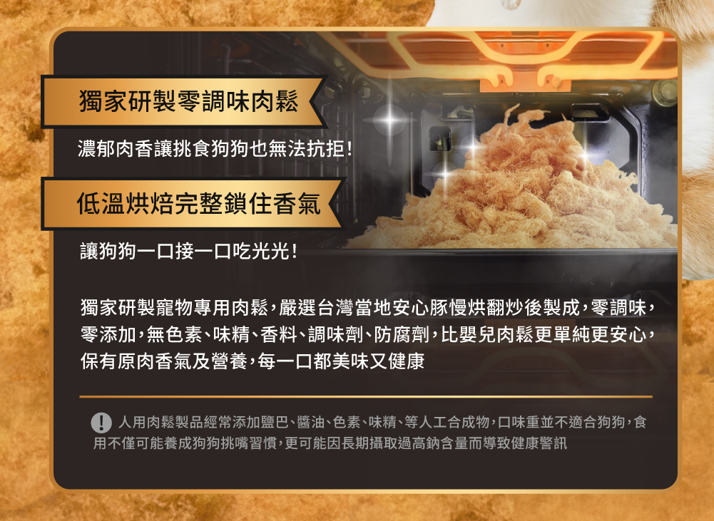 * 0調味肉鬆經由飼料擠壓摩擦易碎裂,但仍會均勻包裹在每一顆飼料上,請安心使用